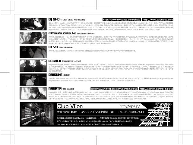 北堀江@VIJONにて、新企画のDANCE MUSIC PARTY☆ 2009/11/2 「祝前日」 『FREE STYLE』 GUEST陣は、TEIONCLUB / SPACE01で活躍している TECHNO界から『DJ SHO』!! そして、Full-on PSY-TRANCE dj 1000DREAM の エレクトロ名義、『ミツダ ダイスケ』 をメインとした、ラインナップにて、お洒落かつ、最高の音質、北堀江@VIJONをお楽しみに! -PROGRESSIVE / TECHNO / ELECTRO HOUSE / PSY-TRANCE DanceParty- ■ 開催日時/2009/11/2/月曜 (祝前日) ■ 場所/北堀江 club vijon ■ OPEN/23:00 CLOSE/5:00 ■