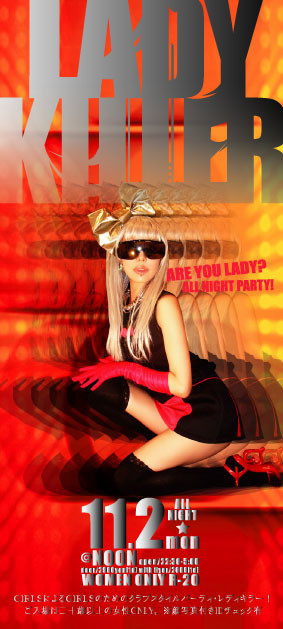 ■レディキラー レディキラーはGIRLSによるGIRLSのためのクラブスタイルパーティ!前身イベントがSTARTした1995年より全国のGIRLSからの熱い支持を受け続け、今宵はGIRLSだけのFUTUREへTRIP!艶めくショウケースにキラめく音のスコール、最高の夜をあなたに!!! NEXT MONTH TITLE〜GIRLS FUTURE!〜 日程/2009.11.2(月・祝前日) 開場/22:30〜5:00 ※オールナイト営業 会場/NOON 大阪府大阪市北区中崎西3-3-8 料金/\2900(1d) 、with flyer \2600(1d) ※二十歳以上の女性のみ入場可。IDチェック有。顔写真付身分証をご提示ください