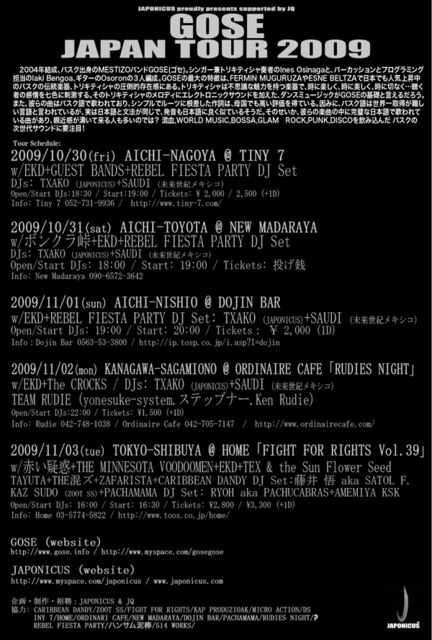 2004年結成、バスク出身のMESTIZOバンドGOSE(ゴセ)。シンガー兼トリキティシャ奏者のInes Osinagaと、パーカッションとプログラミング担当のIaki Bengoa、ギターのOsoronの3人編成。GOSEの最大の特徴は、FERMIN MUGURUZAやESNE BELTZAで日本でも人気上昇中のバスクの伝統楽器、トリキティシャの圧倒的存在感にある。トリキティシャは不思議な魅力を持つ楽器で、時に楽しく、時に美しく、時に切なく…聴く者の感情を七色に刺激する。そのトリキティシャのメロディにエレクトロニックサウンドを加えた、ダンスミュージックがGO