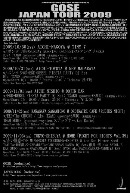 2004年結成、バスク出身のMESTIZOバンドGOSE(ゴセ)。シンガー兼トリキティシャ奏者のInes Osinagaと、パーカッションとプログラミング担当のIaki Bengoa、ギターのOsoronの3人編成。GOSEの最大の特徴は、FERMIN MUGURUZAやESNE BELTZAで日本でも人気上昇中のバスクの伝統楽器、トリキティシャの圧倒的存在感にある。トリキティシャは不思議な魅力を持つ楽器で、時に楽しく、時に美しく、時に切なく…聴く者の感情を七色に刺激する。そのトリキティシャのメロディにエレクトロニックサウンドを加えた、ダンスミュージックがG