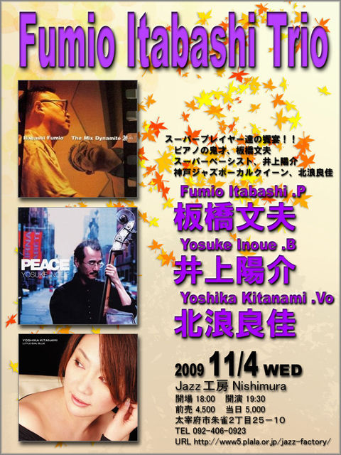 Jazz工房Nishimuraジャズライブのご案内です。 板橋文夫スペシャルトリオ 九州ツアー From Tokyo スーパーミュージシャンの饗宴!!。 ピアノの鬼才、板橋文夫。 70年代、日本のジャズが最も熱かった時期に渡辺貞夫クインテットでデビュー。 日野皓正(tp) クィンテットにも参加、エルビン・ジョーンズワールドツアーに参加するなど国内外トップミュージシャンとの共演も多い。 現在、自ら板橋文夫ジャズオーケストラを率いるなど、熱いピアニスト。 スーパーベーシスト、井上陽介。 スイングジャーナル詩人気投票第一位、現在