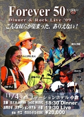 Forever50 Dinner&Rock'09 〜こんな奴らが集まった、ありえない! 日時:2009.11.4(水) Dinner 18:30/Live 19:30 会場:ステーションホテル小倉 料金:¥20,000 出演:浅野孝己(Gt) 鮫島秀樹(Ba) ふとがね金太(Vo) 松田弘(Dr) 蓑輪単志(Key) お問い合わせ:ステーション小倉 TEL:093-512-0390 担当・竹口 TAGC MUSIC