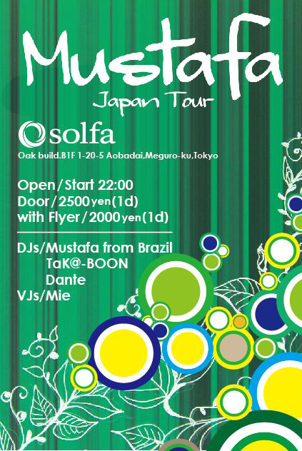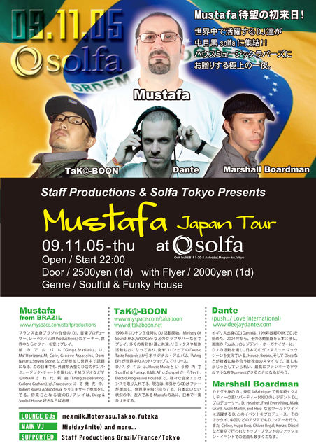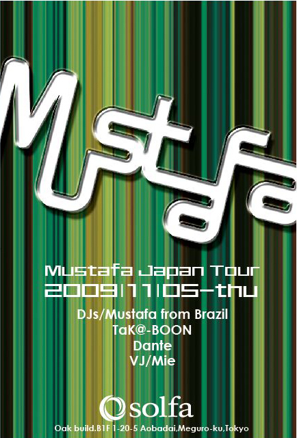 管理人様・コミュニティ参加者の皆様。 お疲れ様です。告知をさせて頂きます。 Traxsourceをチェックしてる方々には、ご存じのDJだと思いますが。 フランス出身、ブラジル在住のMustafaが、この度、初来日します。 そして、Kenn Yamanaka aka. Luv Cityの緊急出演が決定!! Houseが、好きな皆さん、平日ですが一緒に楽しみませんか?! メッセージ頂ければディスカウントを、お取りいたします。 早めにご連絡を!! Staff Productions & Solfa Tokyo Presents 『Mustafa Japan Tour』 5 November 2009 (Thu) Place: Solfa Tok