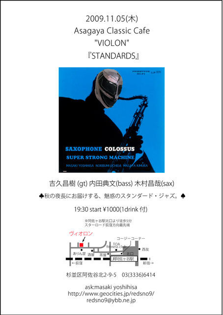 ギターの吉久と申します。毎度告知失礼します。 明日です。 2009/11/5(木) 『STANDARDS』 吉久昌樹gt 内田典文b 木村昌哉sax 阿佐ヶ谷名曲喫茶ヴィオロン 杉並区阿佐谷北2-9-5 03(3336)6414 19:30start ¥1.000(1drink付) 地図 http://qkunnet.hp.infoseek.co.jp/violon.gif SXQ、藤井郷子オーケストラなどで活躍中の木村氏、 ロックからプログレ、即興など幅広く活躍中の内田氏を迎え スタンダード・ジャズを演奏します。 ご来場お待ちしております。 http://www.myspace.com/masakiyoshihisa