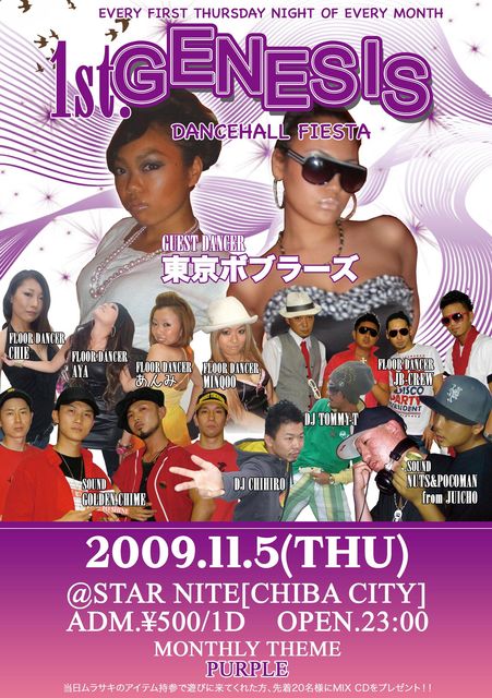 11/5(木)@千葉STARNITE、500円でレゲエを楽しむならここ!今回のGUESTはSPユニットDANCE SHOW CASE!!! 11/5(木) 『1st GENESIS 〜DANCEHALL FIESTA〜』 @千葉STAR NITE 千葉市中央区中央3-17-2ライオンビルBF1 OPEN 23:00〜Till Morning ☆ADM 500yen/1D☆ 【GUEST DANCER】 東京ボブラーズ fr TOKYO 【SOUND】 ・GOLDEN CHIME ・NUTS&POCOMAN fr.JUICHO ・SOUND LIGNUM & DJ CHIHIRO 【FLOOR VIBES】 ・Minqoo ・あんみ。 ・AYA ・CHIE ・JB-CREW ☆ドレスコード【PURPLE=紫】色のアイ