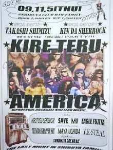 来ました!!!キレ!!! 今回、キレ6はアメリカ版…「キレてるアメリカ人!」でいきます!!! 80´sアメリカROCK、DISCOを本気で意識しながらもガッツリHIPHOPなパーレー! 「なんじゃい!?そりゃ!!」という方こそ是非!!! お待ちしてますッス!! そして、なんとも渋谷FAMILYでの開催は今回でラストっ!! 次回(12/29)から吉祥寺SPCに引っ越しです!! 巣立ちをお祝いしにきてね☆ ☆キレてるアメリカ人☆ 〜80's STYLE仮装PARTY!〜 09.11.5(THU) @SHIBUYA FAMILY DOOR 2000Y