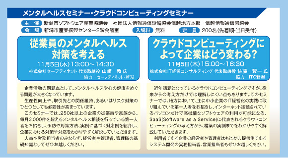 今年も新潟国際ビジネスメッセ2009 http://messe-niigata.jp/ が開かれます。 名称 新潟国際ビジネスメッセ2009 会期 2009年11月5日(木)6日(金)AM10:00〜PM5:00 会場 新潟市産業振興センター 新潟市中央区鐘木185-10 TEL 025-283-1100 http://sansin.or.jp/access1.html 主催 新潟国際ビジネスメッセ2009実行委員会 入場料 無 料 添付のようなビジネスセミナーあります。 出展企業140社は http://www.messe-niigata.jp/messedb/ で検索できます。 もしくは一覧で http://www