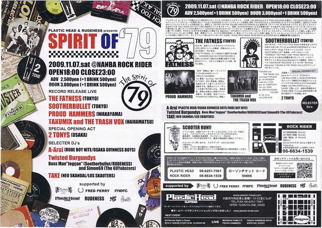 管理人様告知失礼します! PLASTIC HEAD & RUDENESS presents SPIRIT OF '79 2009年11月7日 土曜日 at 難波 ROCK RIDER OPEN18:00 / CLOSE23:00 前売 2,500yen (+1 DRINK 500yen) 当日 3,000yen (+1 DRINK 500yen) ■LIVE THE FATNESS (TOKYO) http://www.fatness-2t-records.com/ SOOTHERBULLET(TOKYO) http://www.myspace.com/sootherbullet PROUD HAMMERS (WAKAYAMA) http://www.proudhammers.com/ TAKUMIX and THE TRASH VOX (HAMAMATSU) http://modernedge-records.com/tatv/ 2