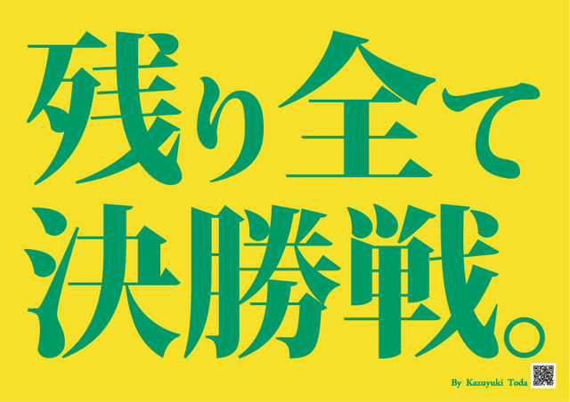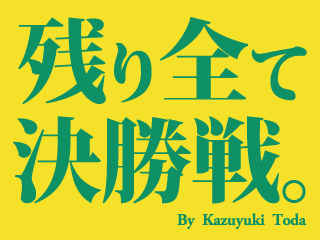 「残り全て決勝戦。」 10月18日のホーム京都戦から、この言葉をフクアリやアウェーのスタジアムで掲げてみませんか。 浦和戦があった3日、去年の背番号41・戸田和幸選手(現・慶南FC)がジェフ愛あふれる思いのこもった日記をブログに書いてくれました(以下、抜粋)。 僕も応援し祈ることしか出来ないけど・・・・・せめて祈ろう。 サッカーの神様は何を思っているのだろうか。 自分の頑張りが少しでも刺激になるのなら僕も必死に闘おう。 落ちちゃダメだぞ、落ちてはいけないクラブなんだから。 残り6つ、全
