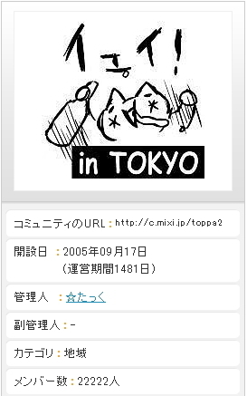 いよいよ本日 まだ参加OKですよ 書き込みの上来場しちゃって下さい 管理人です ついにコミュの参加者22222人突破〜 ってことで初のゾロ目オフを開催します みんなで集まって飲んでワイワイ楽しもうってだけですが 毎回多くの初参加の方にも楽しんで頂けているので、 この機会にいっぱい友達つくっちゃいましょう ジャン