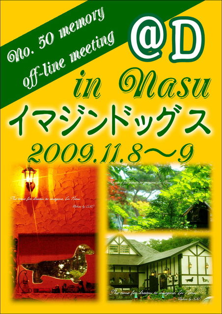 みなさんこんにちは H(^0^)E(^-^)L(^○^)L(^-^)O(^○^)ー!! この度、栃木・イマジンドッグスで第50回記念オフ会として、昨年大好評だったお泊まりオフ会を開催したいと思います!! (^−^)//"" パチパチ 詳細は下記の通りですので“必ず”最後までお読みください 日時:2009.11.8(日)〜9(月)の1泊2日 集合時間:10:15 宿泊場所:イマジンドッグス http://imagine.nasunogahara.co.jp/dogs/ 集合場所:那須ステンドグラス美術館