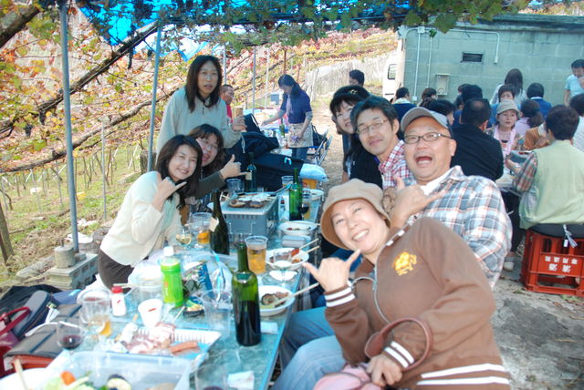 秋のワインカニカピラのお知らせです 集合時間 午前11時 開始時間 11時30分〜3時半まで 集合場所 近鉄南大阪線 上ノ太子駅 午前10時24分発 近鉄南大阪線 大阪阿倍野発準急・橿原神宮前行に乗ると間に合います 橿原神宮前行以外の電車は乗換えが必要です。 会費 5,000円 この畑で収穫された葡萄で絞ったとってもフルーティ−なワインです 赤ワイン、白ワイン飲み放題 マスカットのワイン等、非売品のワインもいっぱい飲めます おいしいバーベキューお釜で炊いたご飯付です