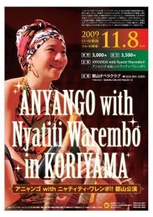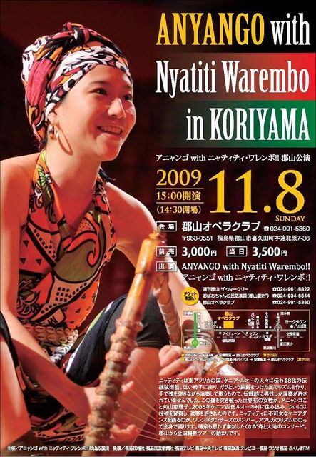 11.8 福島・郡山オペラハウス公演 CD「Nyatiti Diva」発売記念ツアーが、福島県郡山市公演を皮切りに始まります。 ニャティティ、歌、踊り、コーラス、太鼓。フルメンバーでお送りします。 ゆったりした雰囲気のオペラハウス公演です。福島県の方も、県外の方も、ぜひお越しください。 ★福島・郡山オペラハウス公演 * 日時:2009年11月8日(日) 開場14:30/開演15:00 * 会場:郡山オペラクラブ TEL 024-991-5360 〒963-0551 福島県郡山市喜久田町字遠北原7-36 * 出演:Anyango with Nyatiti Warembo!! * 前売:3,000円/