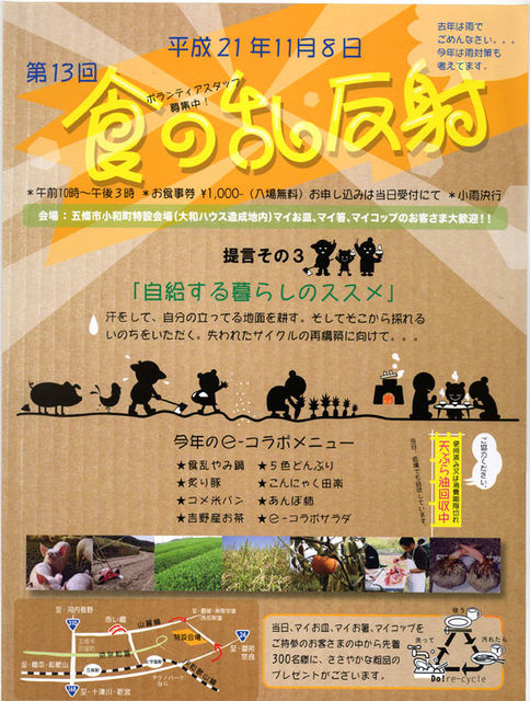 今年も恒例の「食乱」 @Random 出演決定!! みんな来てね! http://www.syokuran.com/index.html 09年食乱、提言・・自給する暮らしのススメ 11月8日(日)午前10時〜午後3時 山麓線沿い大和ハウス造成地内 雨でも決行します。 今年は食乱13年目。テーマは「自給するくらし」のススメ 失われた生活サイクルの現代的な再構築を考えます。 ことしもよろしくお願いします。