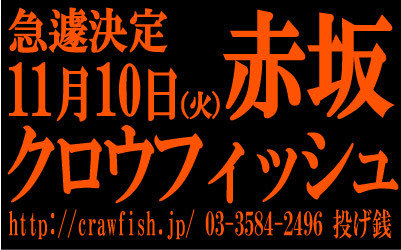 急遽決まった赤坂CRAWFISHでのライヴです。 平日ですが、NoChargeですので、この機会に是非行ってみましょう♪ ☆日時:11/10(火) 20:00〜 ☆NoCharge(投げ銭) ☆連絡先:03-3584-2496 〒107-0052 東京都港区赤坂3-11-7 ソシアル赤坂地下 http://crawfish.jp/ お店もキレイで音が良いとの評判ですねっ!! お料理もおいしそうだっ!! Crawfish=エビ、ですが、なんでエビなんでしょうねぇ〜? どなたか聞いてきてくださいっ!w