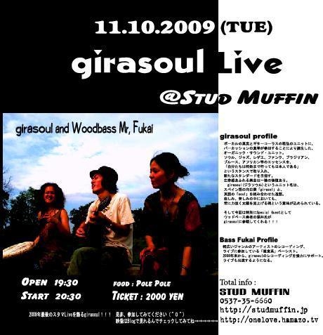 来たる11月10日(火) girasoulが菊川にやってくる 初静岡県です まだご存じない方も多いかも知れませんが とにかくカッコいい、心地いいアーティストさんです!!! 是非一度チェケラーしてください 今回は特別にWoodBassのMr,Fukaiも参戦です 初めての方も一度生バンドを観に来てください Open 19:30 Start 20:30 Ticket 2000円 Food PolePole(お馴染みのタコス屋さん) ご予約はStudMuffin 0537−35−6660 もしくはStudMuffin管理人ナーオーまでメッセく