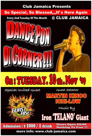 "DANCE PON DI CORNER" on: Tuesday. 10th. Nov at: Club Jamaica adm: 1000yen / 1 drink *Special Invited Guest: BURST RISE * Guest Selector Martin Kinoo & Ichi-Low *Music By: Iron 'TELANO' Giant Kazuki 今回のゲストサウンドは BURST RISE です!!!! 皆様是非遊びに来て下さい!