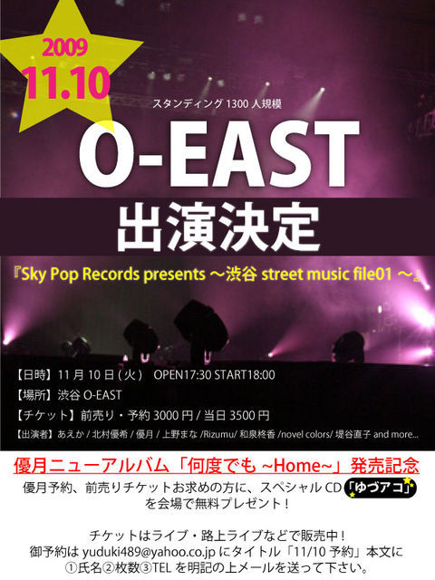 11/10(火) 『Sky Pop Records presents〜渋谷street music file01〜』 ■場所 渋谷O-EAST 渋谷区道玄坂2-14-8 O-EAST (1F) TEL:03-5458-4681 ■時間 Open 17:30/Start 18:00 ※優月出演19:40 ■出演者 堤谷直子/novel colors/Rizumu/和泉柊香/優月/mimika/ 上野まな/北村優希/あえか ※優月出演19:40 ☆サポートメンバー Violin…羽純 Percussion…津田馨太 Guitar…Uzo ■前売3000/当日3500●ドリンク別 ※優月チケットで、特製CD『ゆづアコ』無料プレゼント! ■アクセス ●道玄