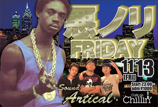 ...ARTICAL PREZENTS... ■悪ノリFRIDAY■ @水戸Cafe'de Chllin' with SoundSystem 2009.11.13(金) START 23:00〜 ADM:\1,000 【Sound】 ・ARTICAL 悪ノリFRIDAY第2回はARTICAL単独スペシャル!!! 一晩中いつ行ってもARTICALで楽しめる事間違いなし! 11月13日はちょっとくらいハメ外しても大丈夫!!BadMindとButtyManは抜きにして、みんなで騒ぎましょう!