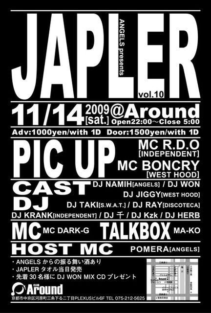 ANGELS主催のパーティ JAPLERです 2009,11/14(sat) JAPLER vol.10 @AROUND ADV:1,000(with 1d) DOOR:\1,500(with 1d) OPEN22:00-CLOSE5:00 ☆CAST☆ DJ's NAMIH[ANGELS] TAKI[S.W.A.T] HERB WON JIGGY[WEST HOOD] KRANK[INDEPENDENT] 千 RAY[DISCOTECA] MC:DARK-G TALK BOX:MA-KO PIC UP LIVE R.D.O[INDEPENDENT] BONCRY[WEST HOOD] HOST MC:POMERA[ANGELS] 今回ももちろん振舞酒あり! 先着30名様にDJ WONによるMIX CDプレゼント! 当日JAPLER