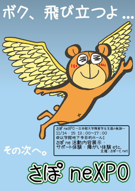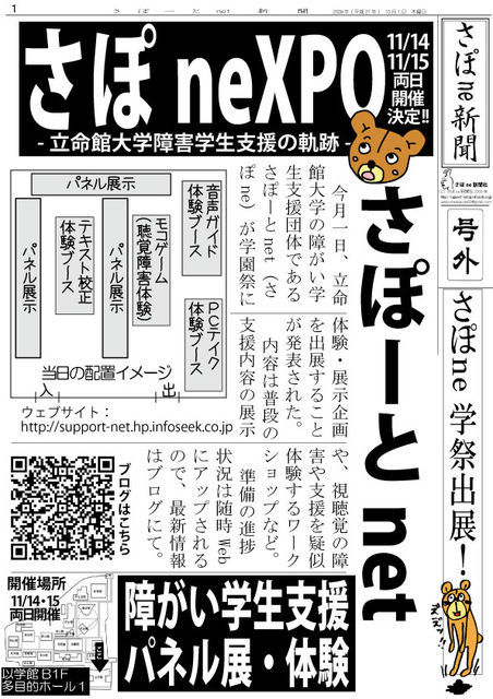 立命館大学学園祭でさぽーとnetが展示企画をやります! 内容は普段の活動内容の展示や、音声ガイド・PCテイク体験、モコゲームなどです 11月14・15日京都にいて時間がある方はぜひお越しください