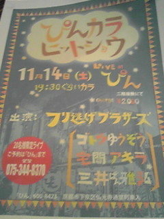 よこっちょから失礼致します。 緊急告知 2009年11月14日(土曜日) ぴんからヒットショウ 【出演】振り逃げ三人衆 ★ゴトウゆうぞう ★宅間アキラ ★三井ぱんぱか ある意味18なLive・・・ こんなLiveはもう二度と見られない・・・かも知れない 20名限定ライブ。 必ずご予約をお願い致します。 会場 ぴん 京都市下京区仏光寺通室町東入ル釘隠町