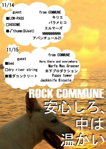 11/14,15 立命館大学衣笠キャンパス学生会館5F8ホール 「ROCK COMMUNE学園祭ライブ〜安心しろ、中は温かい」 :guest 11/14 ■LOW-PASS ■HOSOME ■√thumm(DJ set) 11/15 ■dry river string ■bed ■猿ダコンクリート +ROCK COMMUNE10バンド!! 両日共に 12:00 open 12:30 start ticket:カンパ制(\500程度) 立命館大学衣笠キャンパスアクセス方法↓↓ http://www.ritsumei.jp/accessmap/accessmap_kinugasa_j.html ROCK COMMUNE webサイト↓ http://music.geocities.jp/rockcommuneweb/ 今年もROCK COMMUNE学園祭