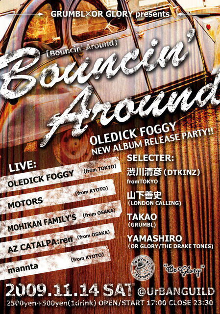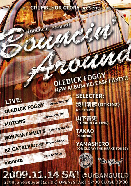 いつもお世話になっております。 告知失礼致します。 MOTORSの皆様当日はどうぞよろしくお願い致します! ★GRUMBL×OR GLORY presents★ 「Bouncin' Around」 11/14(sat)@UrBANGUILD 2500yen+500yen(1drink) OPEN/START 17:00 CLOSE 23:30 ■LIVE ・OLEDICK FOGGY(from TOKYO) ・MOTORS(from KYOTO) ・MOHIKAN FAMYLY'S(from OSAKA) ・AZ CATALPA:ren(from OSAKA) ・mannta(from KYOTO) ■SELECTER ・渋川清彦(from TOKYO) ・山下善史(LONDON CALLING) ・TAKAO(GRUMBL) ・YAMASHIRO(OR