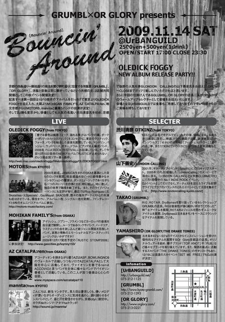 管理人さま、イベント告知させていただきます。 ★GRUMBL×OR GLORY presents★ 「Bouncin' Around」 11/14(sat)@UrBANGUILD 2500yen+500yen(1drink) OPEN/START 17:00 CLOSE 23:30 ■LIVE ・OLEDICK FOGGY(from TOKYO) ・MOTORS(from KYOTO) ・MOHIKAN FAMYLY'S(from OSAKA) ・AZ CATALPA:ren(from OSAKA) ・mannta(from KYOTO) ■SELECTER ・渋川清彦(from TOKYO) ・山下善史(LONDON CALLING) ・TAKAO(GRUMBL) ・YAMASHIRO(OR GLORY/THE DRAKE TONES) 京都の四条通り〜御池通りの南北を繋ぐ堺町通りに位置する