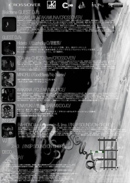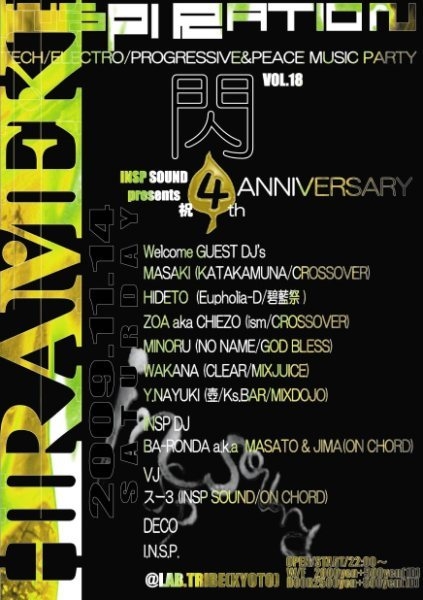 管理人様告知失礼します。 TECH/ELECTRO/PROGRESSIVE&PEACE MUSIC PARTY INSP SOUND presents 祝4th ANNIVERSARY 『INSPIRATION 閃 Vol.18』 2009.11.14 (sat) @LAB.TRIBE(KYOTO) OPEN/START 22:00〜 W/F:2000yen+500yen(1D) DOOR:2500yen+500yen(1D) ーGUEST DJ'sー □MASAKI (KATAKAMUNA/CROSSOVER) □HIDETO (Eupholia-D/碧藍祭 ) □ZOA aka CHIEZO (CROSSOVER/ism) □MINORU (NO NAME/GODBLESS/PARADIS) □WAKANA (CLEAR/MIXJUICE) □Y.NAYUKI (壺/Ks.BAR/MIXDOJO) ―INSP DJ― □BA-RONDA a.k.a MASATO & JIMA (INSP SOUND/ON CHORD)
