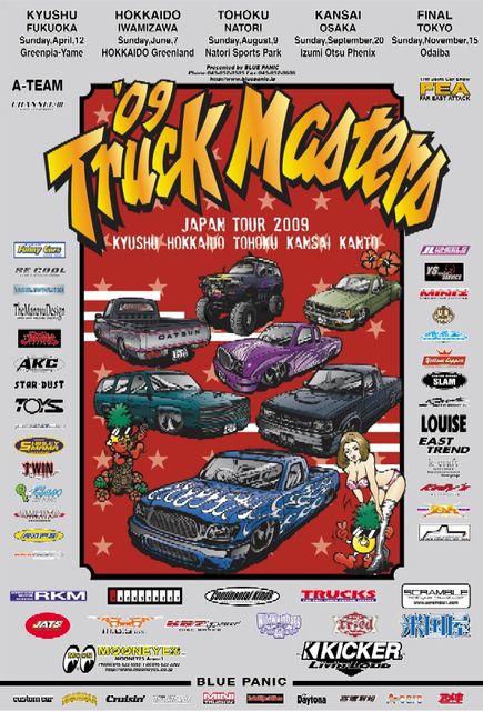 http://www.bluepanic.jp/main-top.htm Truck Masters FINAL が今年も開催されます。 お台場の青海駐車場で開催されます。 詳細は以下のとおり 開催日: 2009年 11月15日(日) 9:00 am 〜3:00 pm 雨天決行 場所: お台場 青海駐車場 (東京国際交流館・船の科学館駅 前) 入場料:当日 ¥1,500−(小学生以下無料) 前売り ¥1,200−(9/12より発売) ※前売り券は全国の各コンビニ「ファミリーマート・サークルKサンクス(要Pコード:616-135) ローソン(要Lコー