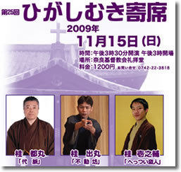 都 丸「代脈」 出 丸「不動坊」 壱之輔「ぜんざい公社」 料金:1200 開演:午後3時30分開演 場所:奈良市・奈良基督教会礼拝堂 問:奈良基督教会0742-22-3818 チラシのネタ、間違ってます…