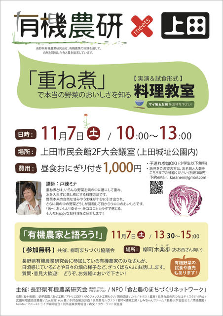 上田市のコミュニティにも投稿したので、重複しますが、失礼します。 __________________ こんなに野菜っておいしかったの!? 来たる11/7土曜日に野菜のおいしさを最大限に引き出す『重ね煮』 という調理法を使った料理教室を行います。 予約は必要ありません。直接10時に市民会館大会議場にお出で下さい。 講師は戸練ミナさんです。 マイ箸、マイ椀持参でどうぞご来場下さ〜い。 おいしいおにぎりも付いて1000円です。 子連れ参加もOKですよ! (託児は予約必要300円、ポスターを参照下さい) その後、有