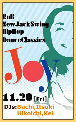 NEWイベント 11月20日金曜日 『 Joy 』 21:00 open DJ: Buchi, Itsuki, Hikoichi, Kei MUSIC: R&B, NewJackSwing, Hiphop, DanceClassics etc... 今回、初開催となるイベントのご紹介です!! 奇数月の第3金曜日は「Joy」☆ タイトル通り、音を楽しんでくださぃっ♪ カッコいぃ音を、DJ陣がオリジナリティーにとんでプレイします!お楽しみにっ ENTRANCE FEE: 一般 / \2,000(1d) メンバーズ,イベントフライヤー / \1,500(1d) 皆様