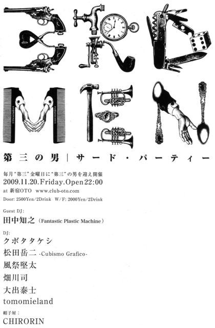 ■毎月第3金曜日■ 「クボタタケシ」と「松田岳二」が毎月"第3"金曜に"第3"の男を迎え開催。 ---☆NEXT 3rd party-------------------------- 毎月第3金曜日 11/20(金) 「第3の男"3rd party"」@新宿OTO http://www.club-oto.com/ OPEN:22:00〜 DOOR:2500yen/2Drink W/F:2000yen/2Drink DJ'S クボタタケシ 松田岳二(Cubismo Grafico) 風祭堅太 畑川司 tomomieland 大出泰士 GUEST:田中知之(Fantastic Plastic Machine) 帽子屋:CHIRORIN 今月の第3の男には・・・・ 自身
