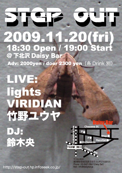 実に半年ぶりのライブが決定いたしました! <STEP OUT>@下北沢daisybar http://www.daisybar.jp/ LIVE; lights VIRIDIAN ...and more!! DJ; 鈴木央 OPEN 18:30 START 19:00 前売り 2000円(D別)/当日 2300円(D別)