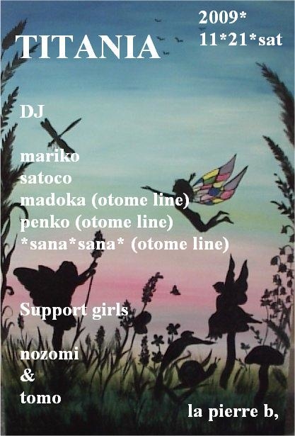 TITANIA @BAR LA PIERRE (2009.11.21-SAT) OKAYAMA CAFE MUSIC様 告知用 from.la pierre b, TITANIA ティーターニア 音楽が好き 日頃は家でCDを聴くだけ・・ でも、今夜はちょっと違う 女性にも音楽(DJ)を身近に感じてほしい そんな思いから生まれた夢の企画です☆ 初めて参加される方も 女性お一人でも お友達と一緒でも ウエルカム 安心して楽しめる BAR STYLE DJ イベントです もちろんDJ演出全てを女の子だけで致します そしてティターニアと