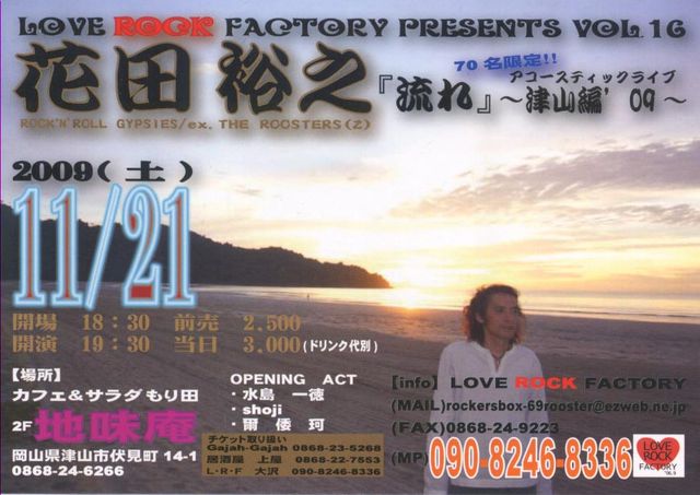 ライブの告知をさせていただきます。 LOVE ROCK FACTORY PRESENTS VOL.16 ・花田 裕之 アコースティックライブ 中国流れ 09' (ex.THE ROOSTERS) ☆70名限定☆ 2009年11月21日(土) 0PEN 18:30 START 19:30 前売 2,500 当日 3,000 (ドリンク代別) OPENING ACT ・水島 一徳 ・shoji ・爾倭珂(倉敷) DJ・U.N.C.L.E.TAKU 場所>カフェ&サラダ もり田2F 地味庵 津山市伏見町14-1 tel 0868-24-6266 【info】LOVE ROCK FACTORY 09082468336 rockersbo