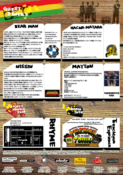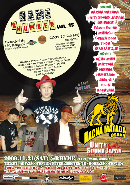 告知させて頂きます。 2009年 最後の『Name & Number』は、大阪から【25時間REGGAE】や【大阪城 お花見DANCE】でお馴染みの『HACNAMATADA』!!! 更に、大阪は泉州・岸和田の伝説のサウンドクルー【RED PRINCE】より『BEAR MAN』が来岡です!!! そして、お隣 兵庫県からも『NISSIN』『MATTON』『YAMAZARU』『UNITY SOUND JAPAN』が来岡!!! もちろん!地元勢も豪華な面子です!!! 楽しくないワケがない内容となっております!!! お待ちしております! 『Name & Number 』vol.15 2009.11.21(SAT) @RHYME