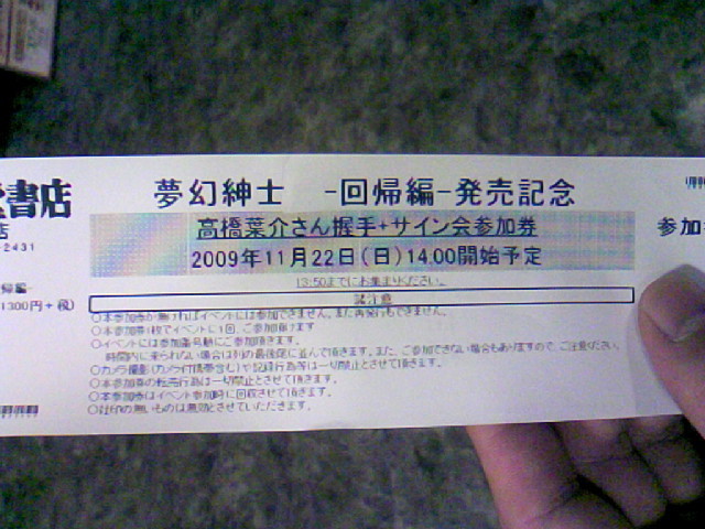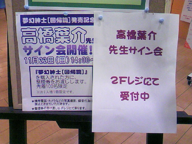 mixinewsから転載させて頂きました(^O^)/(一部編集) 高橋葉介先生、10月31日に三省堂書店神保町本店でサイン会 http://news.mixi.jp/view_news.pl?id=988396&media_id=86 (10/13 19:53 コミックナタリー) 高橋葉介先生の「夢幻紳士 回帰篇」が、早川書房より10月23日に発売となる。 これを記念し10月31日に三省堂書店神保町本店にて、高橋先生のサイン会が開催される。 「夢幻紳士 回帰篇」は、高橋先生の過去の作品「夢幻紳士 怪奇篇」のセルフリメイク。ミステリマガジン(早川書房)にて連載された13篇に加え、8ページの描