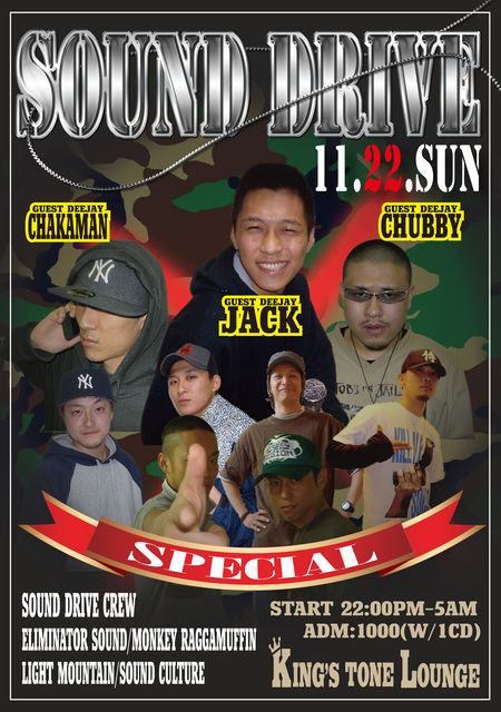 告知失礼します。 11/22 SOUND DRIVE SPECIAL @ KING'S TONE LOUNGE Guest DeeJay JACK CHAKAMAN CHUBBY Music by SOUND DRIVE CREW ELIMINATOR SOUND MONKEY RAGGAMUFFIN LIGHT MOUNTAIN SOUND CULTURE Sound System by HIGHER FORTH ADM:1000yen (20名様ELIMINATOR SOUND Mix CD Present!!) Start23pm-TILL Morning! 〜SOUND DRIVE〜 心斎橋アメリカ村KING'S TONE LOUNGEにて2005年からスタート。 2008年より毎週日曜開催中。 Oldiesから、BrandNewReg
