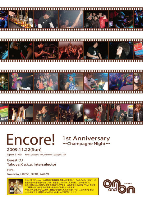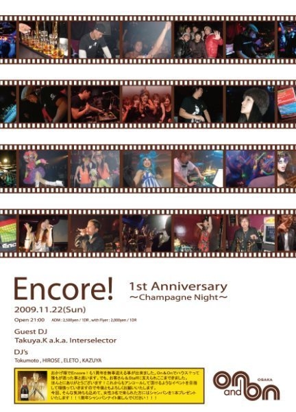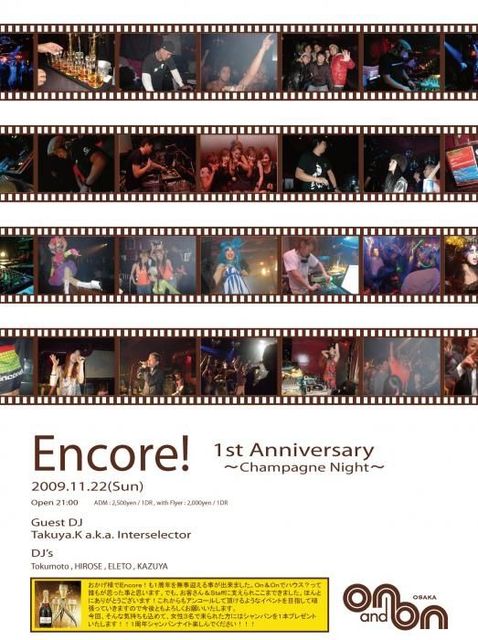 管理人様告知失礼いたします。 梅田on&onでハウスイベントが発足してから1年を迎えようとしています!!! 新旧問わず関西の様々なclubでプレイしているDJ陣が梅田に集結します。 GuestDJも初Encore!の時に来て頂いたTakuya.K a.k.a. Interselector氏を迎えまたまた宴になること間違い無しです!!!!!! しかも祝して女性に限るのですが女性3名で来られたグループにシャンパン1本プレゼントします!!!!!!!! on&on太っ腹ですw 是非ともシャンパンgetしに来て下さい♪ 男性&女性ともゲスト料金は\1,500/1DRとなってますので是非ともEncore! 1