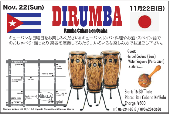 Que?? 皆さんご無沙汰しております いきなりですが、イベントのご紹介をさせていただきます。 11月22日(日)、CUBANな休日を一緒にすごしませんか?? RUMBAの演奏を聴いたり、歌ったり、たわいもないおしゃべりを楽しんだり もちろん踊ったり、楽器を演奏してみたり… 思い思いに楽しんでくださいね 今回のDIRUMBAというのはCUBAN RUMBAの演奏にベースが加わったものです。 オリジナルRUMBAとはひと味違ったDIRUMBA 是非お楽しみください 当日はcaldosa(豚肉とお芋いっぱいスープ)をご用意して