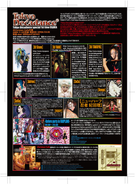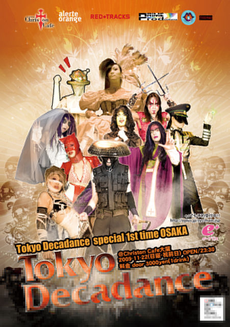 Tokyo Decadance special 1st time OSAKA 日時 11月22日(日曜・祝前日)23:30 OPEN 場所 Christon Cafe 大阪 住所 大阪府大阪市北区小松原町4-29 電話 06-6364-6565 料金 door 3000yen(e+でも予約受付中!!http://eplus.jp) **e+で予約された方、個性的な派手ファッションでお越しのお客様を入場優先とさせて頂きます。 地図 http://www.mapion.co.jp/m/34.6996833333333_135.504097222222_10/ ついにデカダンスが大阪初上陸!! ヨーロッパツアーなどで各国を周ってきたデカダンスが、初の国内遠征! ヨーロッパ映画祭のアフターパ