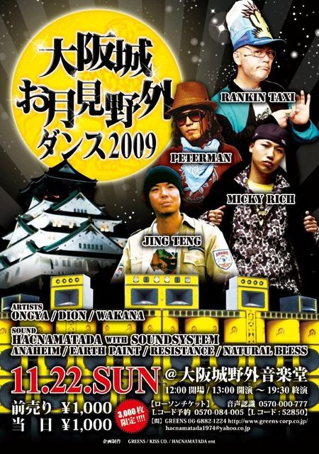 「大阪城お月見野外ダンス2009」 @大阪城野外音楽堂 11月22日(日) 12:00開場13:00開演〜19:30終演 GUEST ARTISTS RANKIN TAXI / PETERMAN MICKY RICH / JING TENG ARTISTS ONGYA / DION / SOUCHIN / WAKANA SOUND HACNAMATADA with SOUNDSYSTEM ANAHEIM / EARTH PAINT / RESISTANCE / NATURAL BLESS 雨天決行(荒天中止) 前売り¥1000 当日¥1000(3000枚限定) 【ローソンチケット】 音声認識 0570-000-777 Lコード予約 0570-084-005 (Lコード:52850) 【問】 GREENS 06-6882