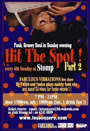毎月第4日曜日、 東心斎橋club Stompで開かれてる Hit The Spot ! Part 2。 FABULOUS VIBRATIONS、 DJ TAIZOとTANICOの3組で行われてる サンデーイブニングファンクセッションでございますが、 11月は祝日前の22日という事で 急遽初のオールナイトで開催することになりました。 いつもより長い時間、深い時間に どっぷりたっぷり踊っていただけます。 オールナイトゲストには、 昨年のスペシャルでの盛り上がりが思い出される、 DJLINCOLN!! 神戸ZINNIAからDJ TATSURO。 22:00から5:00までの7時間 飲みに喋りにもちろん踊り
