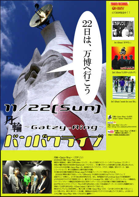 万博ライブの時間が決まりました!! 30分×2回のライブで、もう一組のアーティストさんと交互の出演になります! ●万博記念公園無料ライブ● 日程:11月22日(日) 時間:30分×2回のライブになります! 【14:00〜14:30】 月輪〜Gatzy Ring〜 (転換・サウンドチェックリハなど15分) 【14:45〜15:15】 illca (転換15分) 【15:30〜16:00】 月輪〜Gatzy Ring〜 (転換15分) 【16:15〜16:45】 illca 終了 場所:万博記念公園 中央口入ってすぐ ※雨天の場合、中止となります その日ライブ終了後、心斎