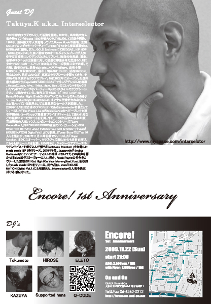 『Encore!』1周年記念 BIG HOUSE DANCE!! Guest DJ:Takuya.K a.k.a. Interselector 記念すべきEncore!1周年イベントは第1回目のGuest DJとしてイベントを盛り上げていただいき、国内最大級のクラブageHa@STUDIO COASTでResidentDJとして活躍しているTakuya.K a.k.a. Interselector氏を再度迎え熱い夜になること間違いなし!!!!!! DATE: 11月22日(日) @ On & On(Umeda) TIME: 21:00 ~ LATE PRICE: M/L2500- w1Drink GENRE: House ARTISTS: Takuya.K Interselector, Tokumoto, HIROSE (Style!), ELETO, KAZUYA. 今回、On店長の