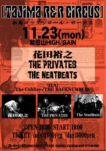 今年の春に開催された「但馬乱痴気」から約半年!今回は「TAJIMA R&R CIRCUS」とゆう名のもとに開催されます!前回のプライべーツそしてニートビーツに加え今回は花田裕之氏参戦!豪華面子で楽しい夜になること間違いなしです!是非とも皆様のご参加お待ちしております!