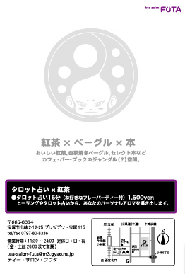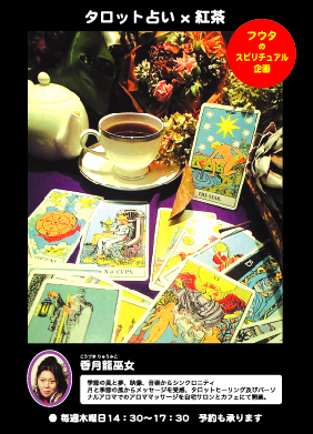 tea salon FUTAとタロット占い・香月龍巫女の夢のコラボレーション 『占いカフェ』が実現!!! 11/26(thu)から毎週木曜日 14:30〜17:30 タロット占い15分+お好きなフレーバーティー 1500yen 予約も承ります。 tea salon FUTA 0797-80-8336(11:30~24:00 日・祝は定休日) 木曜の午後はtea salon FUTAで癒しの昼下がりを★